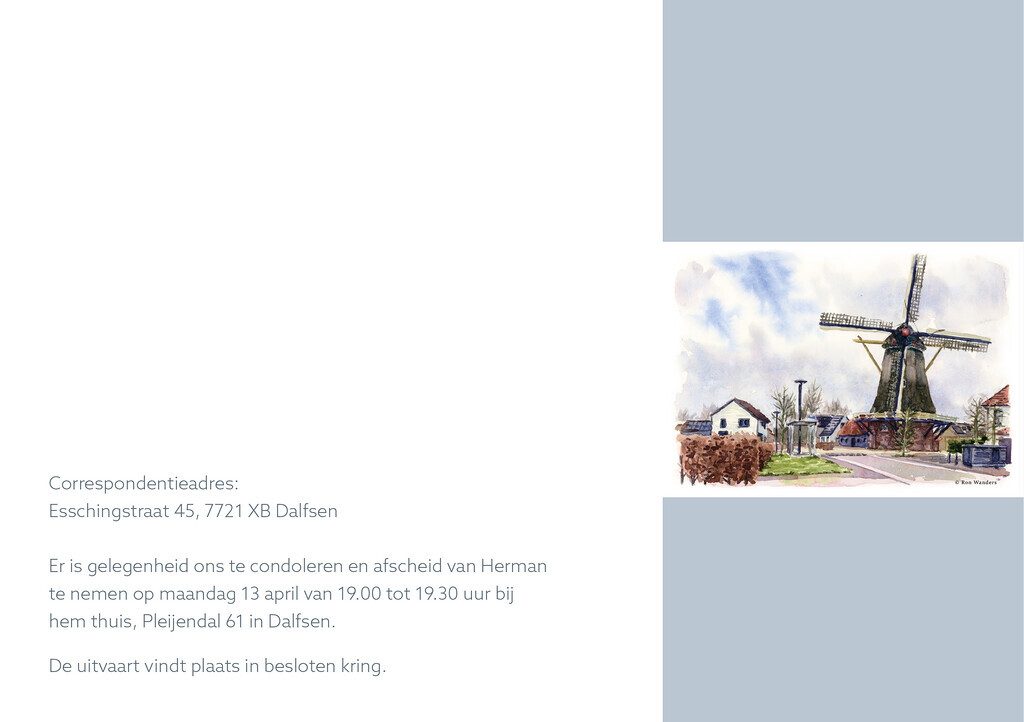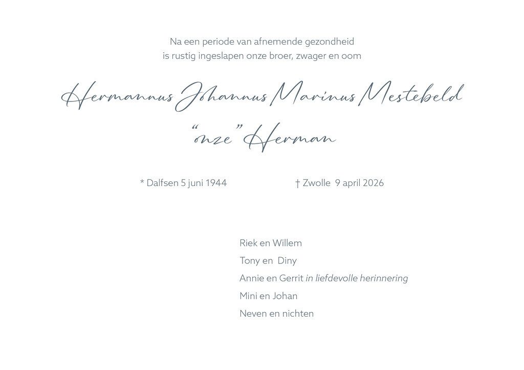 Overlijden Herman Mestebeld Overlijden DalfsenGepubliceerd: vrijdag 10 april 2026 10:00Publicatie door: Erik Janssen van Uitvaartverzorging Vechtdal Overlijden Herman Mestebeld Foto's 3
