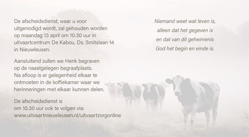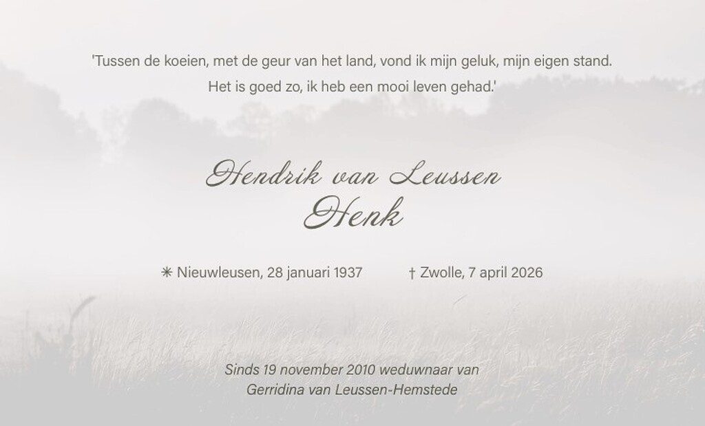 Overlijdensbericht Henk van Leussen Overlijden NieuwleusenGepubliceerd: vrijdag 10 april 2026 10:56Publicatie door: Clara Klein Foto's 3