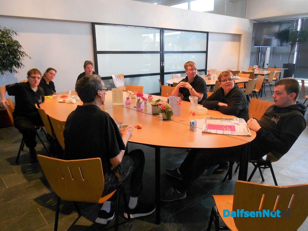 Binnen 5 minuten staan we al in het prachtig gemeentehuis, een imposant gebouw met 2 grote vleugels. Hier brandt de kachel, lekker, want het is buiten echt koud. Kijk Willy, hier links is de horeca van de gemeente, welke geheel wordt verzorgd door mensen met met een beperking op de arbeidsmarkt.Die hebben er zichtbaar plezier in. Deze zitten juist zelf aan de lunch.