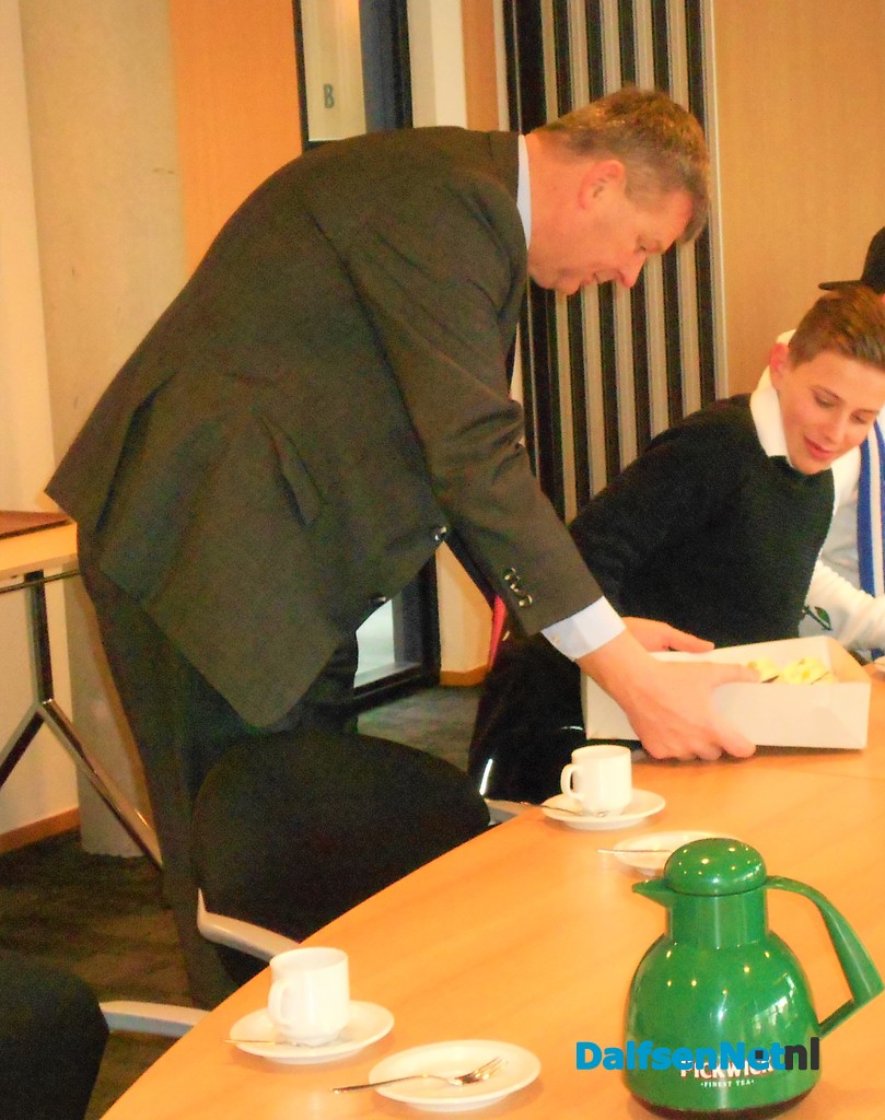 De groep heeft flink de vaart er in en staan inmiddels al boven, op weg naar een lokaal waar speciaal voor ons een presentatie met beeld is gemaakt door de wethouder Roelof Bos. Ondertussen staat Klaas al gereed met een grote doos met gebak, dat ziet er lekker uit. We gaan dus schijnbaar eerst aan de koffie met gebak, ondertussen stelde de heer Roelof Bos zich voor en vertelt dat we na de koffie even naar een andere ruimte gaan waar de echte presentatie is. Want er is heel veel te vertellen.