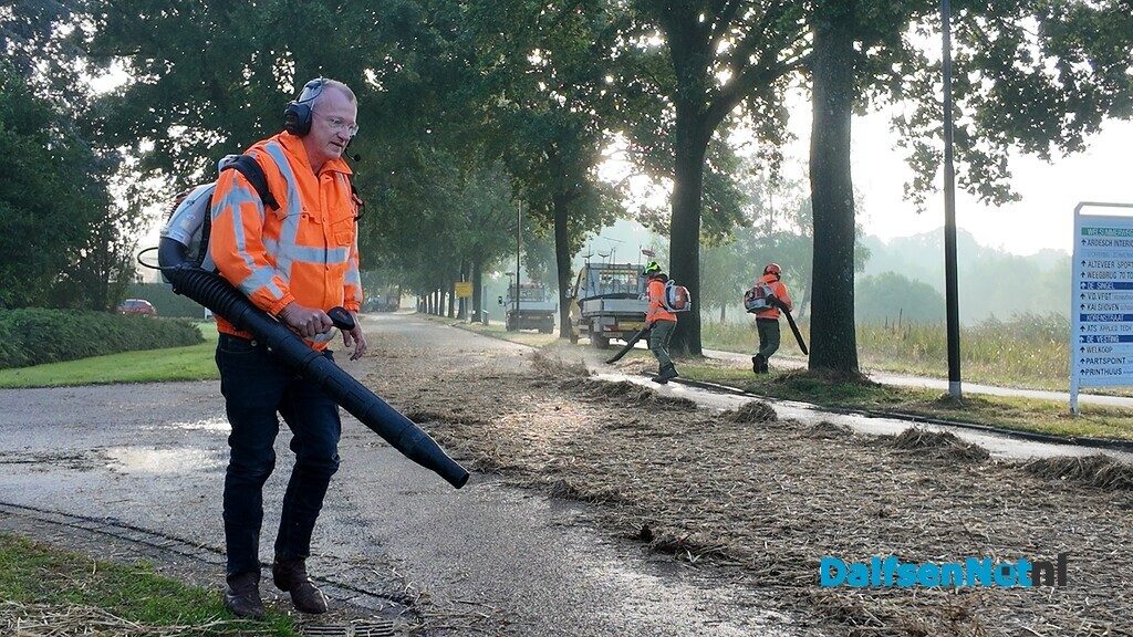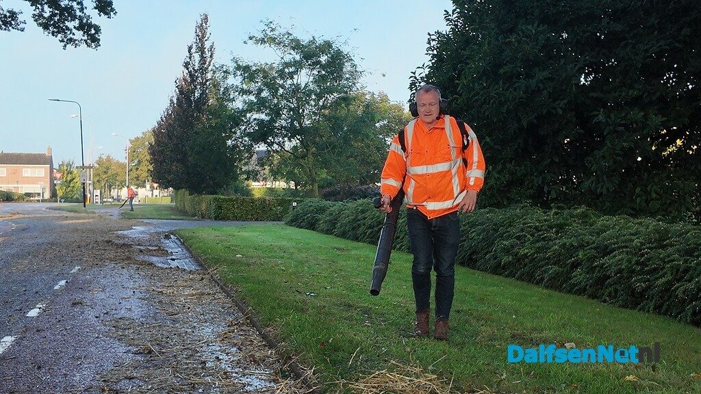 DALFSEN – Burgemeester Sijbom hielp zondagmorgen al vroeg meer om het stro weg te blazen, dat op de toegangswegen naar Dalfsen gestrooid was door Normaal anhangers.